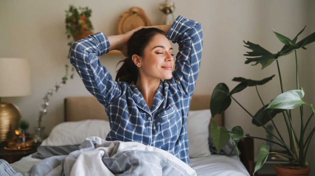 2. Sanft in den Tag starten: Setze dich im Bett auf, strecke dich, öffne das Fenster und lasse Licht ins Zimmer.